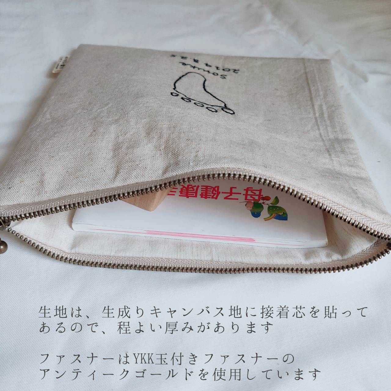 シンプル生成り生地に一針一針丁寧に手刺繍いたします