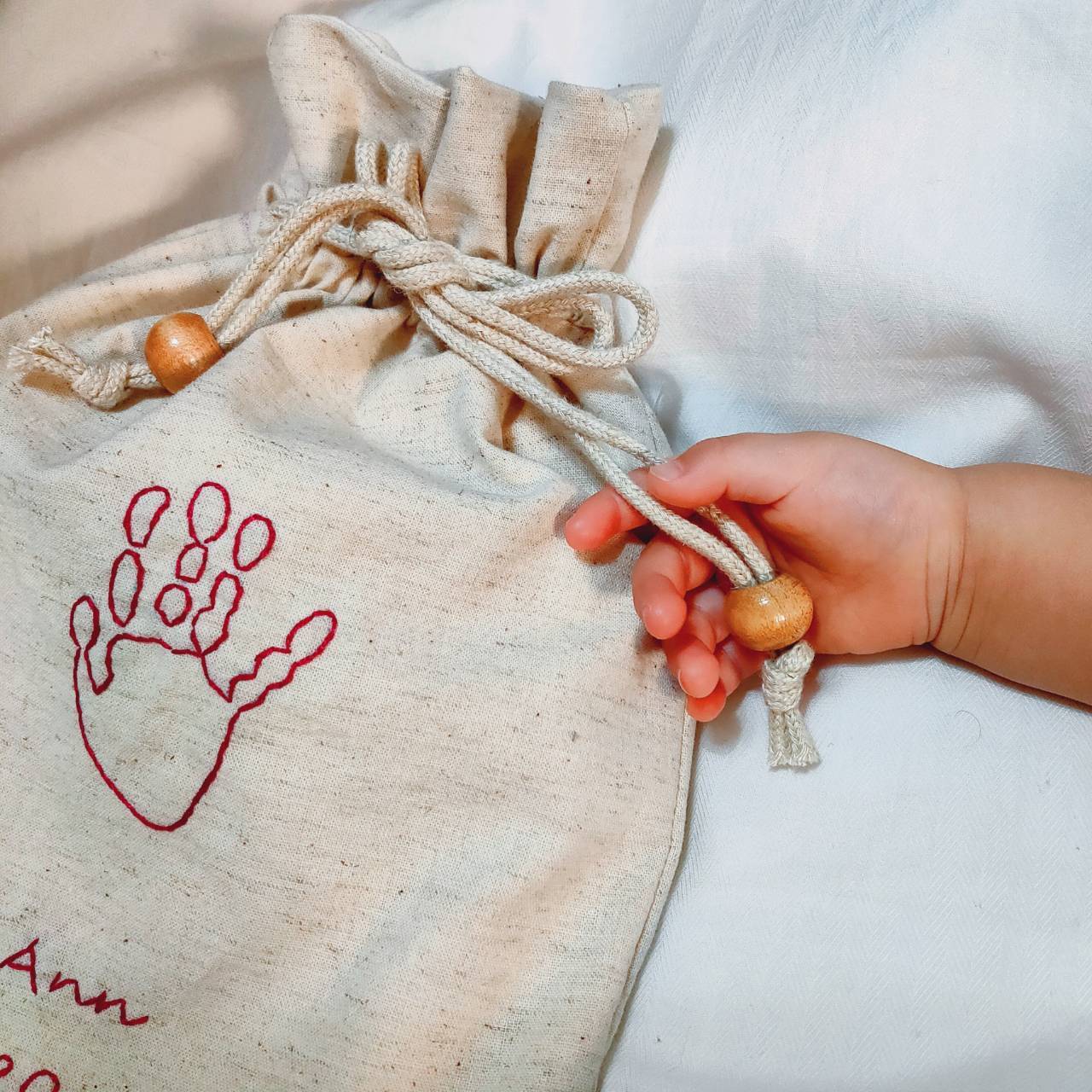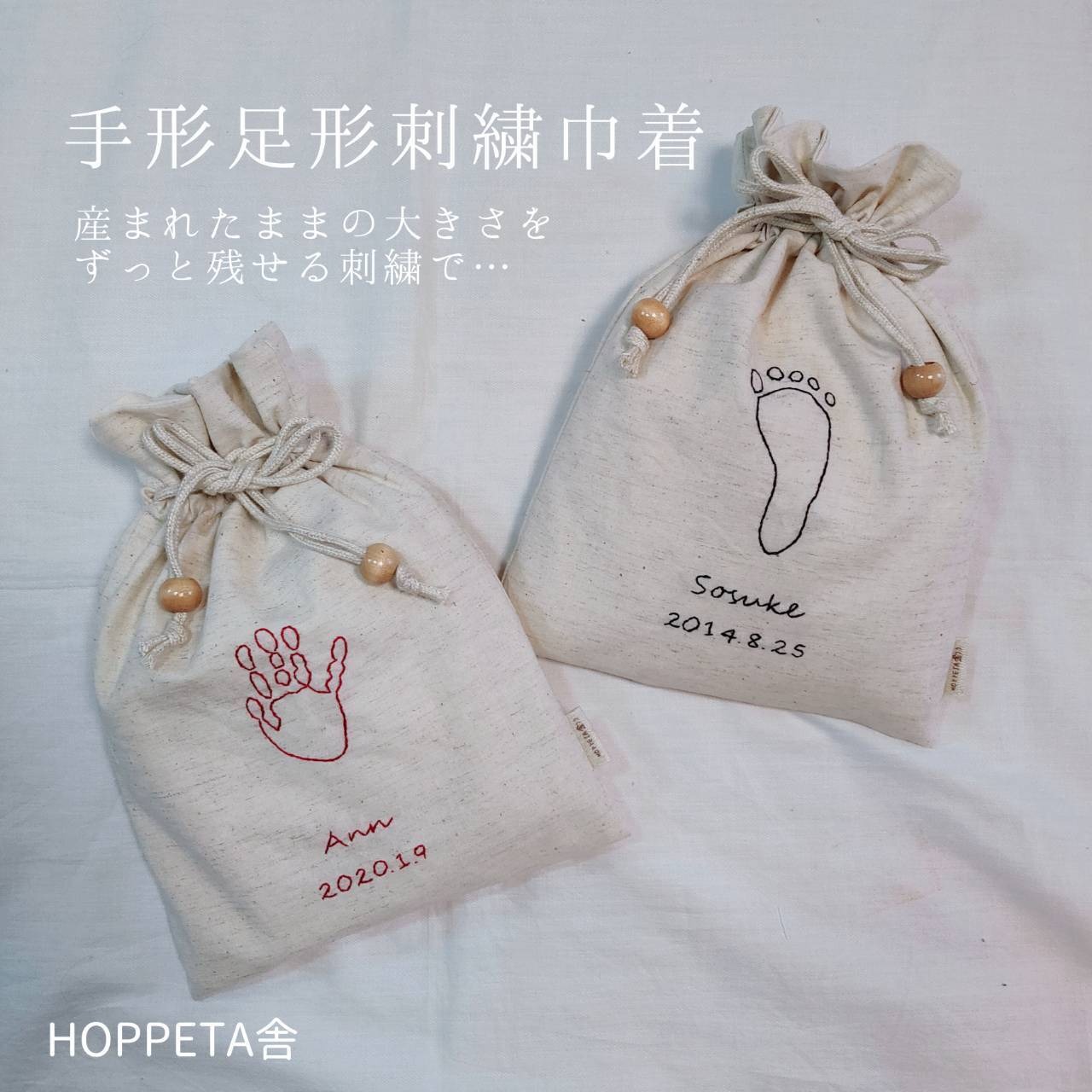 巾着には手形か足形どちらか1つ刺繍しますので、ご希望をご指示下さい