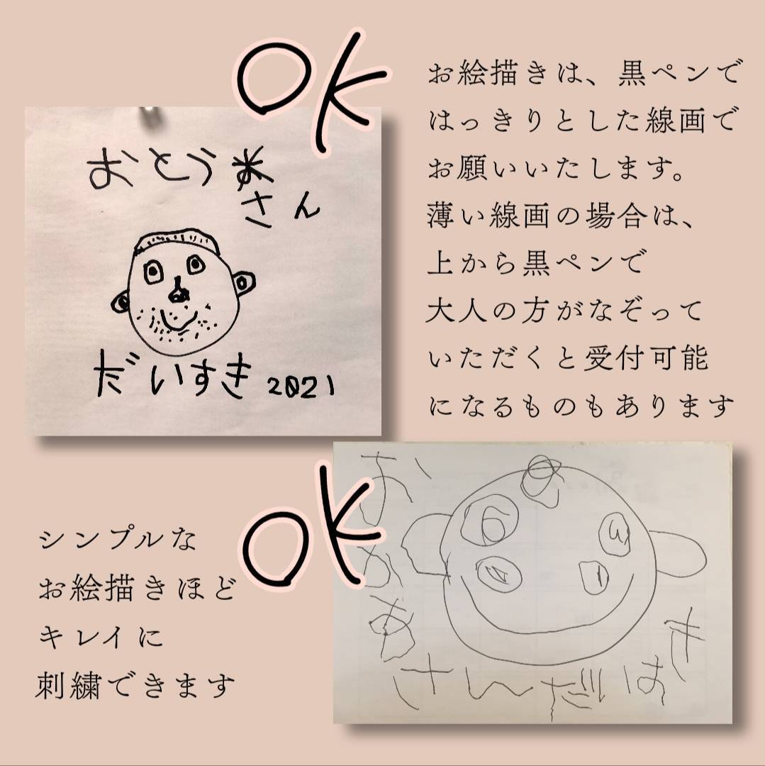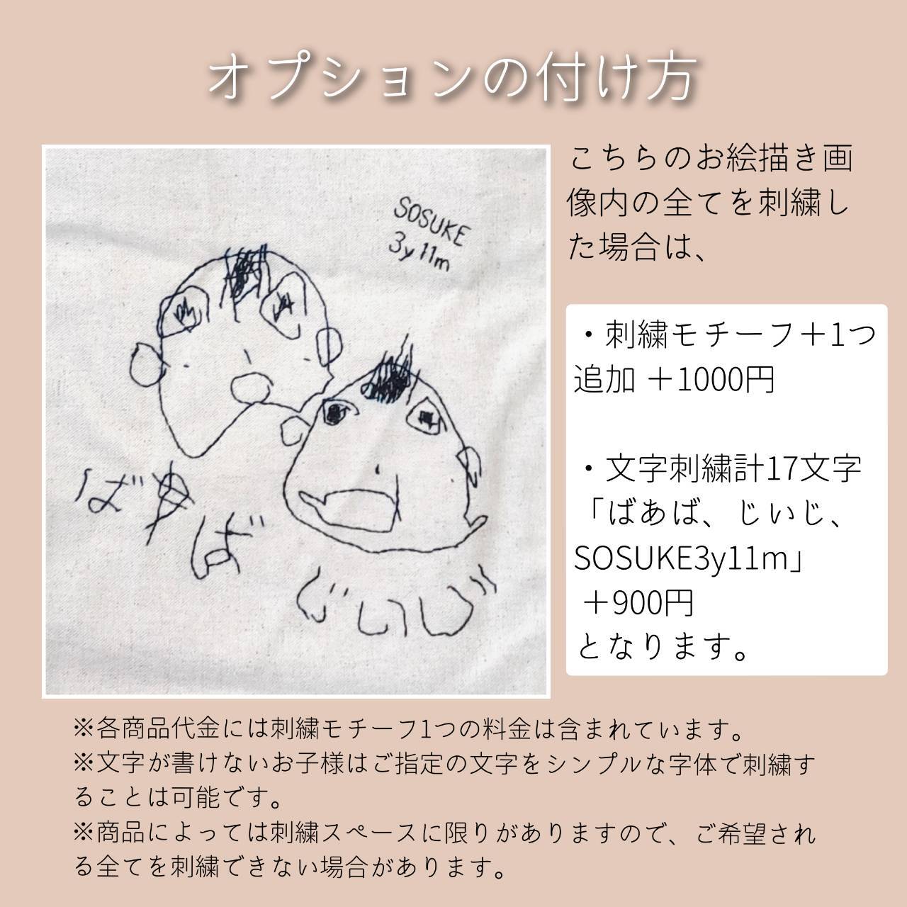 ・文字刺繍は、お子様の手書き文字も可能ですので、有料オプションを選択してからご決済お願いします。文字が描けないお子様でしたら、お名前、年齢、短文メッセージなどご指定の文字を「刺繍ご希望の文字」欄にご入力下さい。